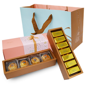 此款中秋禮盒的特徵就是他有兩層的設計喔,除了包裝小巧可愛之外,也是個輕盈無負擔的內容量,上層有蛋黃酥,下層有巧克力維也納、杏仁沙布列、瓦克酥片、抺茶芝麻餅,是個禮輕情意重的最佳中秋伴手禮呢!
